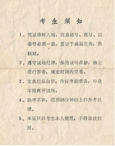 江苏省77级有2轮考试,11月28日初试,12月23日复试。直到10月21日《人民日报》发文章,我才相信真的恢复了高考。这时,对我而言,考大学,是梦想,更如做梦。首先,我实际上只读了一年不到的初中,后来也与“文化”不沾边。1969年初投亲插队,因成份问题,种地十年,成了妇女强劳力。江苏是农业高产区,高产是像绣花一样精耕细作的结果,精耕细作意味着我们一年忙到头。一次双抢插秧,田里野菱的尖角刺进了脚,没空找针挑,愣是等化了脓,连脓带刺一起挤出来的。除了忙,又遇文化荒年,农村的文化元素更少,很难见到有字的纸。因此,有“敬惜字纸”的习俗。经我追寻,不时也有收获。一次在一位小学校长家找到一本油印的《怎样识五线谱》,饥不择食,对每个字符都研究了一番,直到自认为弄懂了为止。1971年,队里会计悄悄告诉我一个信息:另一个公社的新华书店来了一批《新华字典》。我毫不犹豫,隔天走了36里路,花一块钱,抢购到一本。字典,那可是字字珠玑,偷挡搂空就犒赏自己一点。那时虽已有电灯,但要节约用电,每家只准开一盏灯。我是投亲插队,这盏灯不可能在我桌旁。我备了一盏可调光小台灯,可调成5、3或2支光。经与生产队长软磨硬泡,而且保证只使用2支光,终于破格获准使用台灯。由于电力不足,2支光的小灯泡只是微微发红而已,书只能离灯泡一寸远。脱粒时节,社员轮流加班,随着一捆捆谷物的喂入,脱粒机一阵阵加大马力,小灯泡就一阵阵熄灭。还经常停电,只能用煤油灯。因为按人口供应煤油,只能使用比较省油的、用墨水瓶自制的土灯。土灯亮度和高度都有限,灯放在书后、书侧都看不出,只能抱着灯看书。过不多久,脸上、鼻孔里就被煤油烟熏得黑乎乎的。就这样,把一本《新华字典》从凡例一直看到化学元素周期表。虽然生吞活剥、丢三忘四,但那时,她是我唯一的语文老师。1974年,革文化之命的风声松动了一些,我也迁到陶文绫舅妈家。她在公社中学当初中语文老师,能不时悄悄带回一本书,如《中国上古史演义》《德伯家的苔丝》,有一次是一套线装的《聊斋志异》。当时的规矩是:不能打听书的来源,保证按时还书。借阅期限有时只有一个晚上。我是计划外读者,只能她看上半夜,我看下半夜。好在照明条件已有改善,可以根据眼睛的疲劳程度,将台灯的亮度从2支光逐渐调到5支光。可能看《聊斋志异》的人不多,能留两星期,容我逐字查字典。一字多解,要根据上下文挑一解;又要断句,才能读通。一行字可能要看几遍。当然,越看越快,最后,可一目数行。这套书啃下来后,文言阅读能力大为提高。后来应付语文卷中加标点、文言题的能力,主要来自于此。