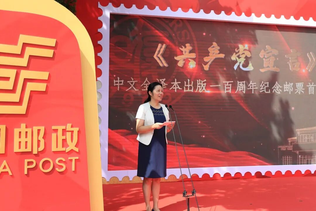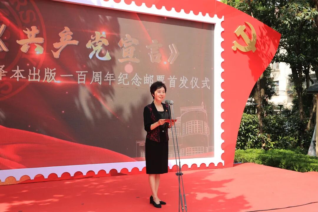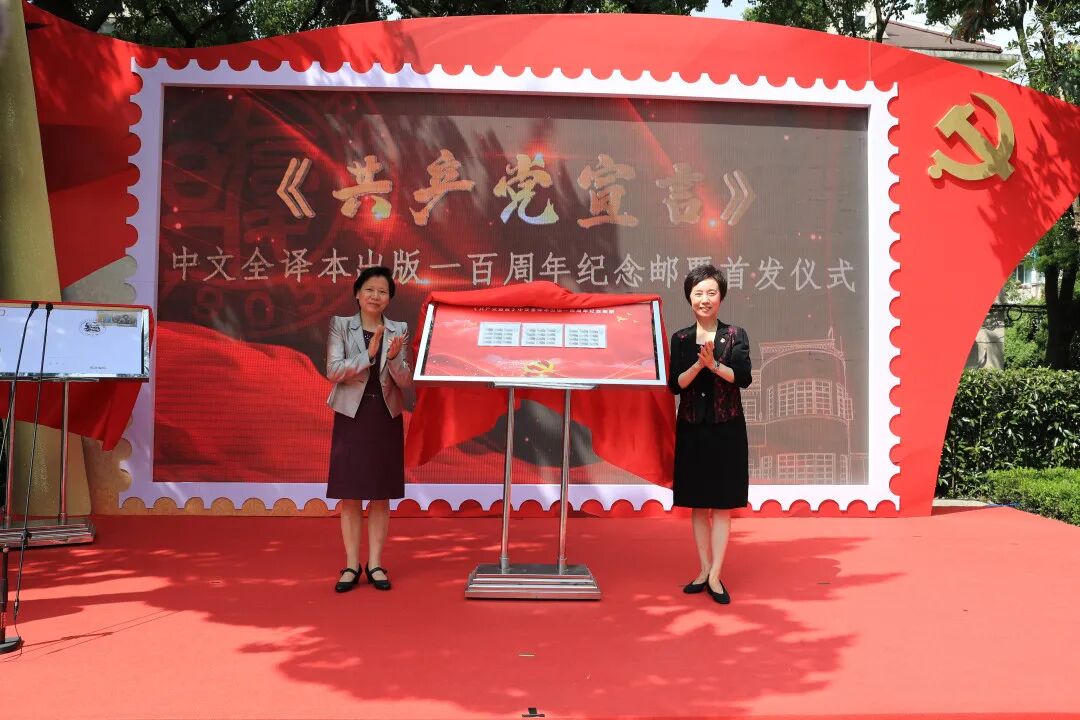 上海市人民政府副秘书长虞丽娟,复旦大学党委书记焦扬,上海市委宣传部原副部长、解放日报报业集团原党委书记、社长、1964届新闻系校友贾树枚,上海市邮政管理局党组书记、局长冯力虎,中国邮政集团有限公司上海市分公司党委书记、总经理王俭等出席首发仪式。虞丽娟与焦扬共同为《共产党宣言》中译本出版一百周年纪念邮票揭幕。