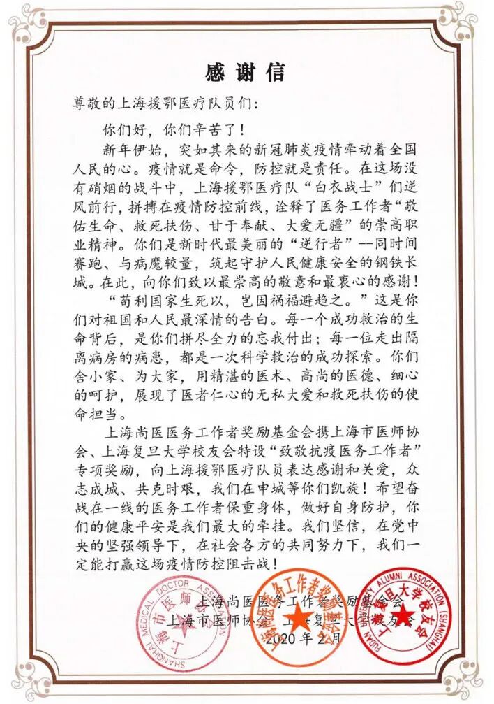 上海尚医医务工作者奖励基金会、上海市医师协会、上海复旦大学校友会联合致上海援鄂医疗队员的感谢信