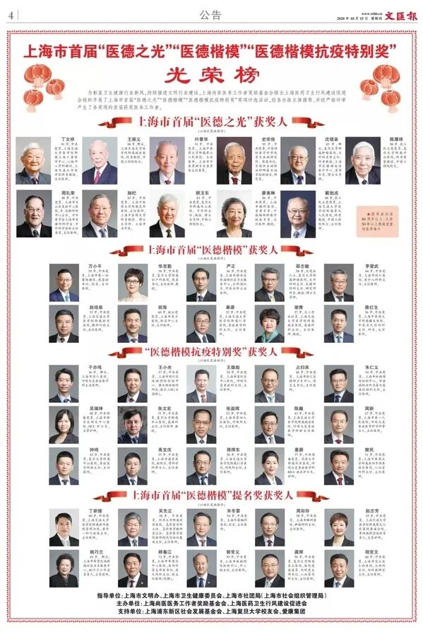 复旦上医沈镇宙、陈灏珠、顾玉东等11位80周岁以上、从医50年以上、德高望重的医界泰斗荣膺“医德之光”奖项,华克勤、邵志敏等10位医务工作者获“医德楷模”奖项,龚辉等10位医务工作者获“医德楷模”提名奖,张文宏、钟鸣、禹宝庆等15位抗疫先锋获本届“医德楷模”抗疫特别奖。
