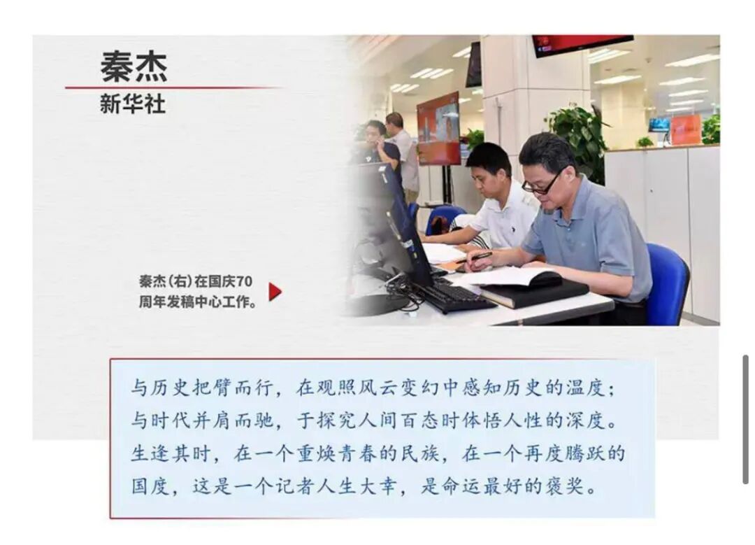 秦杰1984年从复旦大学中文系毕业后进入新华社工作至今。三十多年的新闻实践中,秦杰一直从事时政、文化、科技、环保等领域的报道,采写了数百万字的各类体裁的新闻稿件。他长期承担中央主要领导同志的采访报道任务,无论是在条件艰苦的青藏高原,还是在行程万里频密的高访之中,他都能不辞辛苦、日夜奋战,以高度的政治责任感和精益求精的职业精神出色地完成任务。在担任中央新闻采访中心主任后,秦杰先后组织、指挥、协调了一系列国内外颇具影响力的新闻作品,他参与采写的《更高举起改革开放伟大旗帜——写在邓小平同志诞辰110周年之际》和牵头采写的《弄潮儿向涛头立——习近平主席出席二十国集团领导人杭州峰会系列活动纪实》获得中国新闻特别奖。