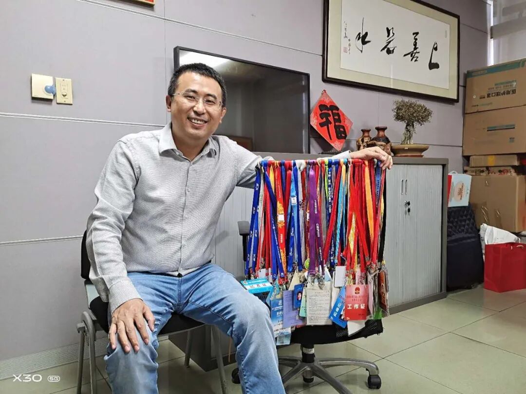 96级校友黄启明与他的采访证合影