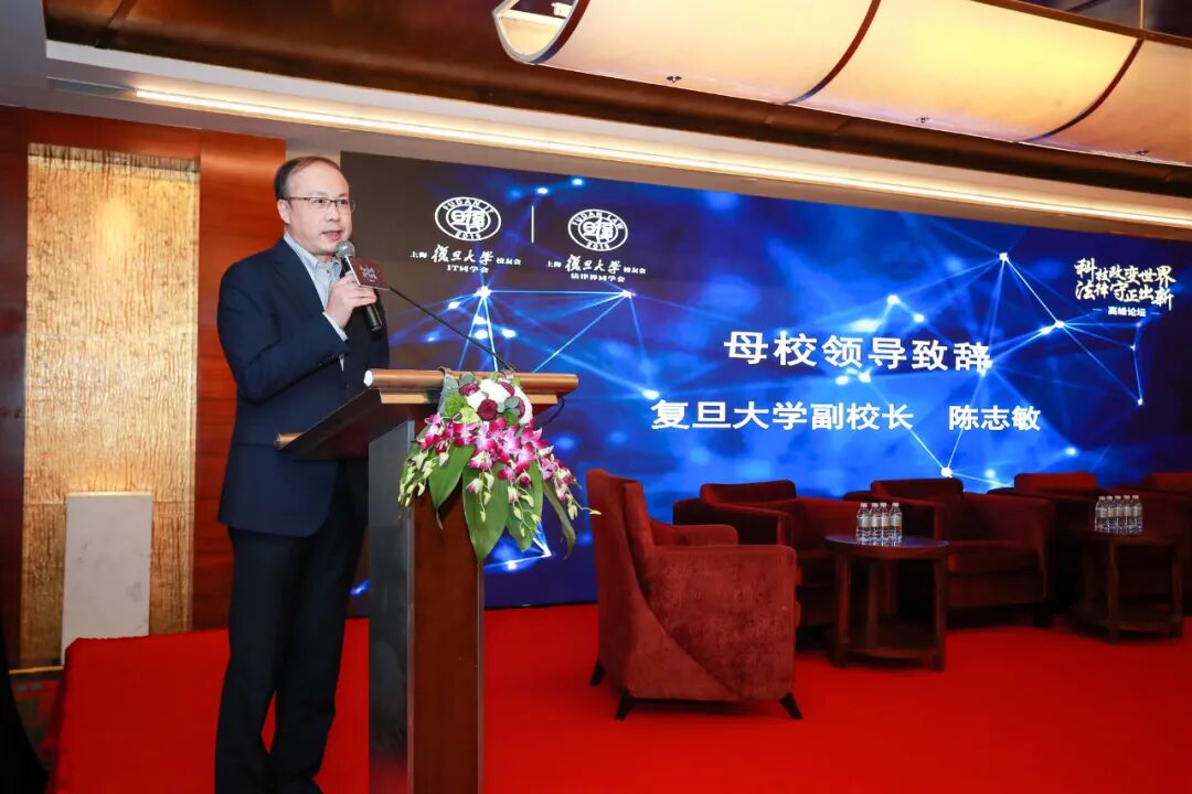 论坛开始,陈志敏副校长首先代表母校致辞。他表示出席本次活动非常荣幸,复旦大学的双一流建设强调推进融合创新。“计算机学科的建设,一定要找应用场景,所以我非常欢迎在学校里和文科院系合作,包括法学院。我们也希望IT学科、文科、业界三方有更好的对接、更好的合作。我们一定会做出非常有意义有价值的研究成果。”陈校长期待同学会跨界形式不断地延续下去,深入合作,并祝愿同学会不断发展壮大,对学校,对母院提供更大的支持。